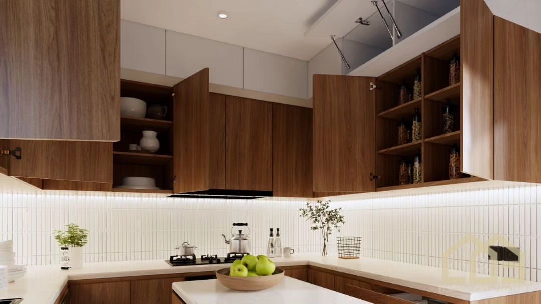 The kitchen set features clean lines and simple geometric shapes, free from excessive ornamentation, Each element is crafted to provide a neat and harmonious appearance. The Kitchen set adopts neutral colors, which help create a sense of a larger and brighter space, and it easily complements various decorations.
